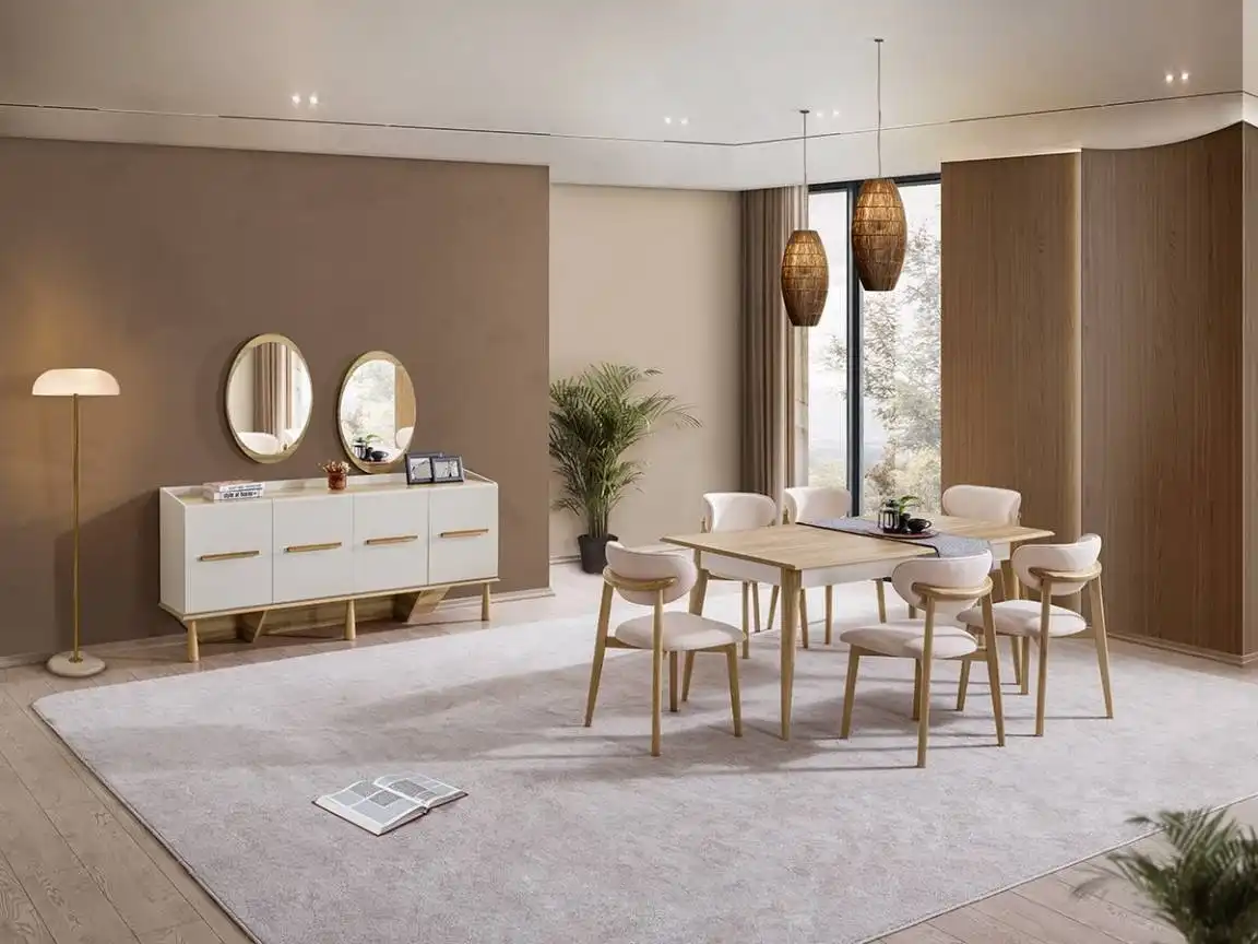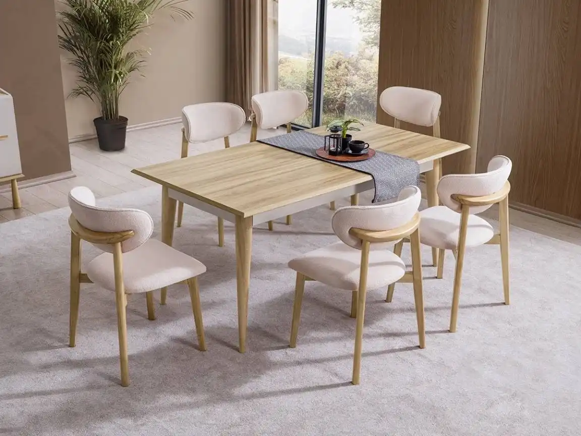 Moon Modern Yemek Odası, çeşitli iç tasarım stillerine uyum sağlayacak şekilde tasarlanmıştır. Minimalist, modern, endüstriyel veya rustik tarz dekorasyonlarda mükemmel bir şekilde yerini bulur. Farklı renk ve kaplama seçenekleriyle, mevcut dekorunuza uyumlu bir seçim yapabilirsiniz.